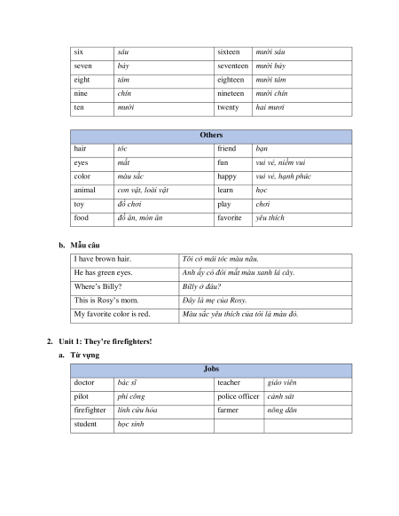 seventeen mười bảy eight tám eighteen mười tám nine chín nineteen mười chín ten mười twenty hai mươi Others hair tóc friend bạn eyes mắt fun vui vẻ, niềm vui color màu sắc happy vui vẻ, hạnh phúc animal con vật, loài vật learn học toy đồ chơi play chơi food đồ ăn, món ăn favorite yêu thích b. Mẫu câu I have brown hair.