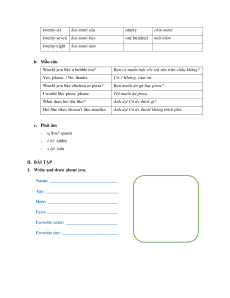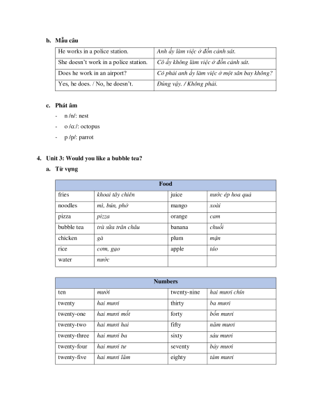 4. Unit 3: Would you like a bubble tea? a. Từ vựng Food fries khoai tây chiên juice nước ép hoa quả noodles mì, bún, phở mango xoài pizza pizza orange cam bubble tea trà sữa trân châu banana chuối chicken gà plum mận rice cơm, gạo apple táo water nước Numbers ten mười twenty-nine hai mươi chín twenty hai mươi thirty ba mươi twenty-one hai mươi mốt forty bốn mươi twenty-two hai mươi hai fifty năm mươi twenty-three hai mươi ba sixty sáu mươi twenty-four hai mươi tư seventy bảy mươi twenty-five hai mươi lăm eighty tám mươi