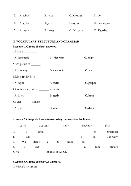 Exercise 1. Choose the best answers. 1. I live in _______. A. lemonade B. Viet Nam C. chips 2. We get up at _______. A. birthday B. 6 o'clock C. water 3. My birthday is in _______. A. April B. swim C. grapes