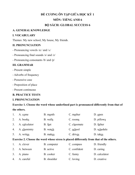 Đề cương ôn tập Giữa kì 1 Tiếng Anh 6 Global Success