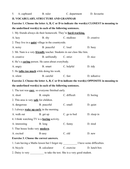 Exercise 1. Choose the letter A, B, C or D to indicate the word(s) CLOSEST in meaning to