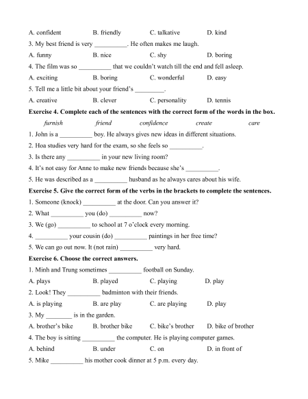 Exercise 4. Complete each of the sentences with the correct form of the words in the box. furnish friend confidence create care