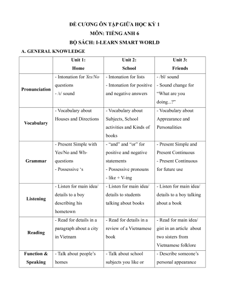 Đề cương ôn tập Giữa kì 1 Tiếng Anh 6 ilearn Smart world
