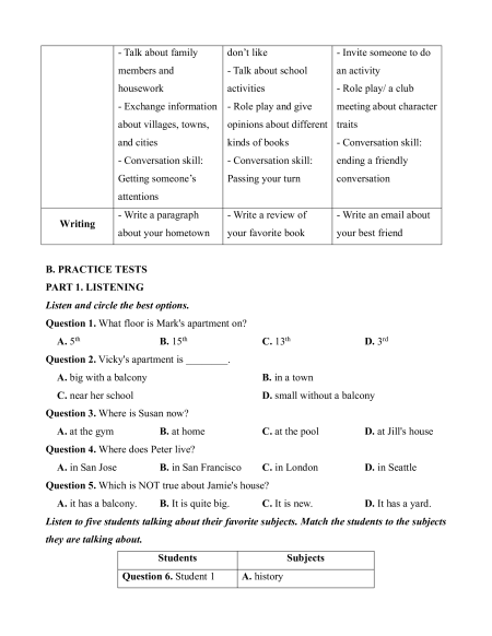 opinions about different traits and cities kinds of books - Conversation skill: - Conversation skill: - Conversation skill: ending a friendly Getting someone’s Passing your turn conversation attentions - Write a paragraph - Write a review of - Write an email about Writing about your hometown your favorite book your best friend B. PRACTICE TESTS PART 1. LISTENING