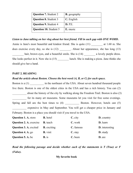 they are talking about. Students Subjects Question 6. Student 1 A. history Question 7. Student 2 B. geography Question 8. Student 3 C. English Question 9. Student 4 D. P.E. Question 10. Student 5 E. music