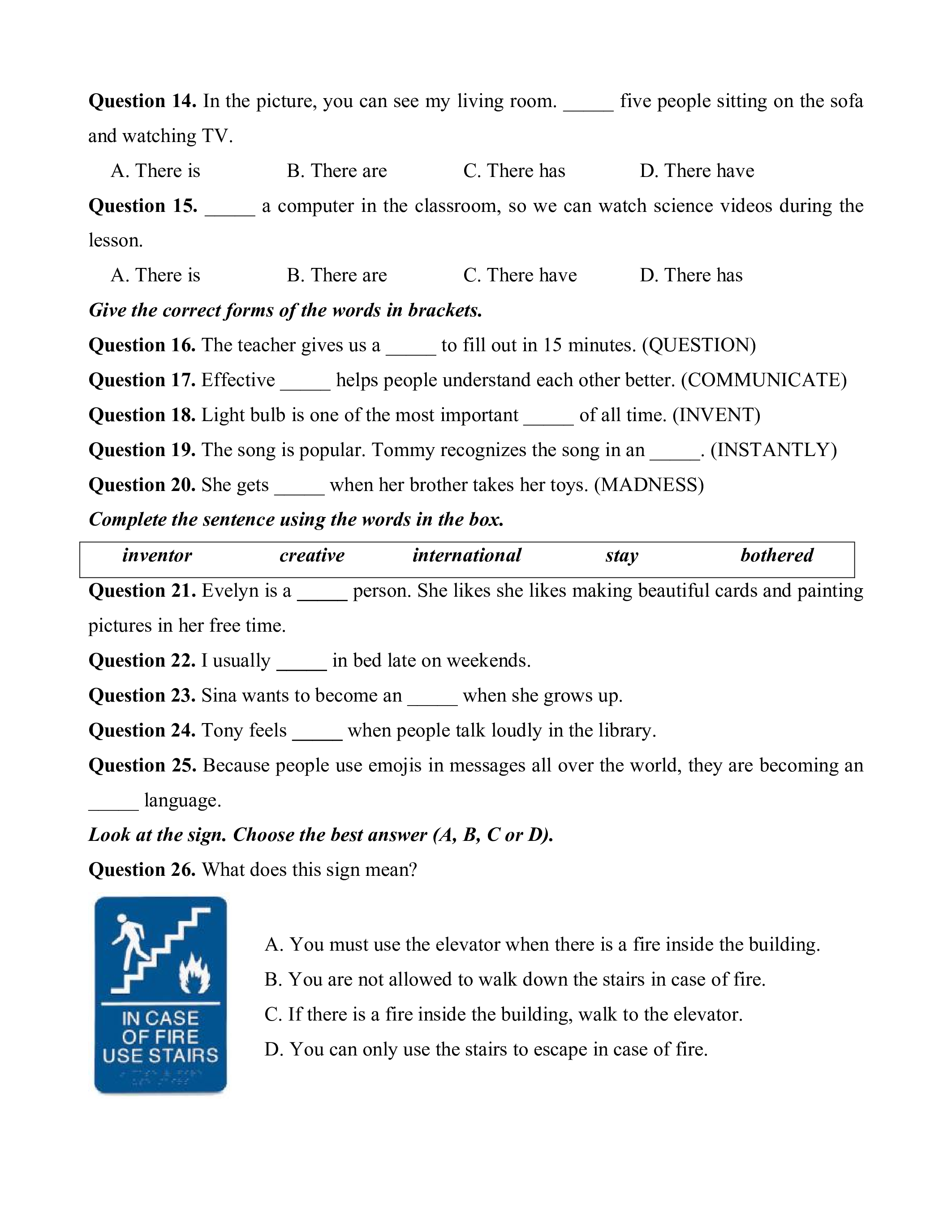 Question 15. _____ a computer in the classroom, so we can watch science videos during the lesson. A. There is B. There are C. There have D. There has