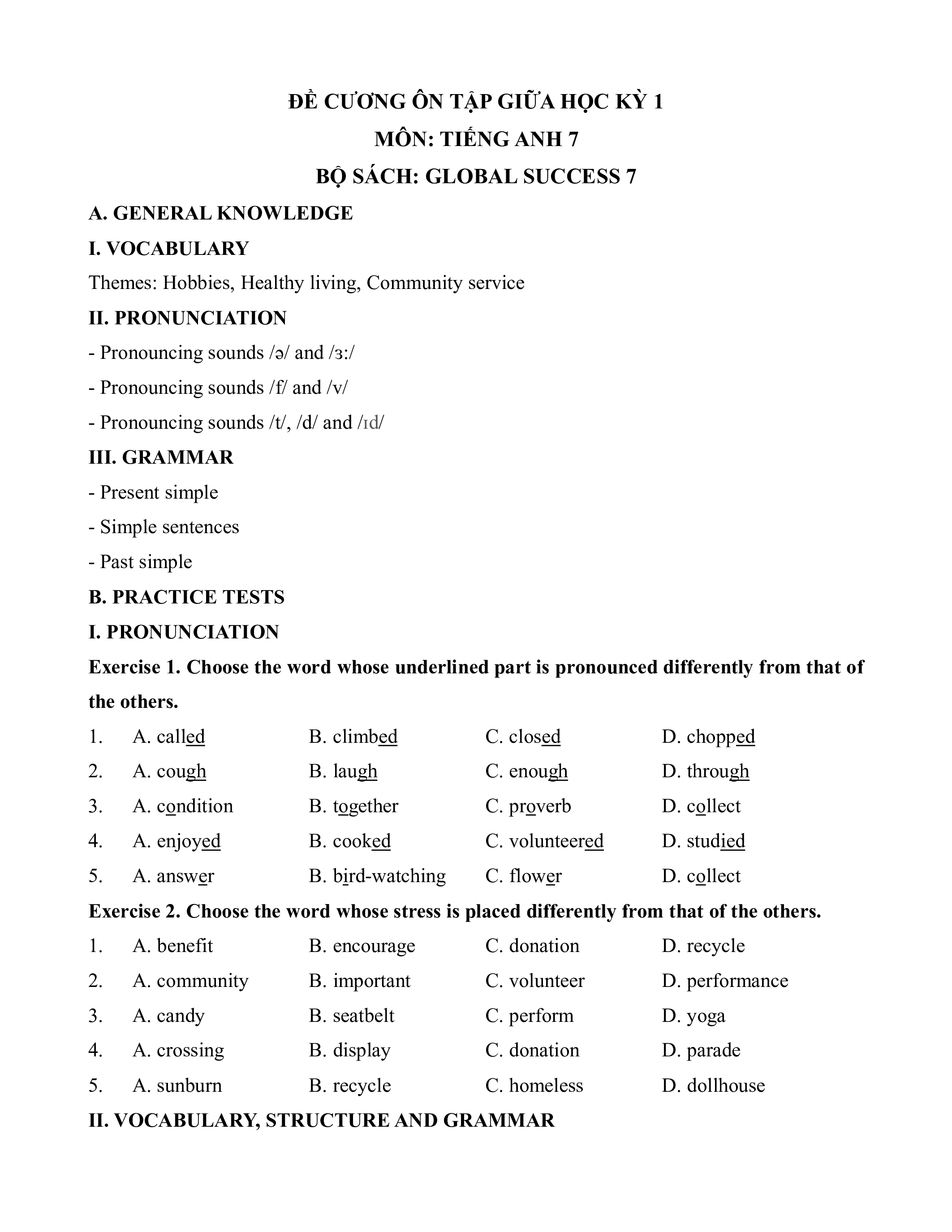 Đề cương ôn tập Giữa kì 1 Tiếng Anh 7 Global Success