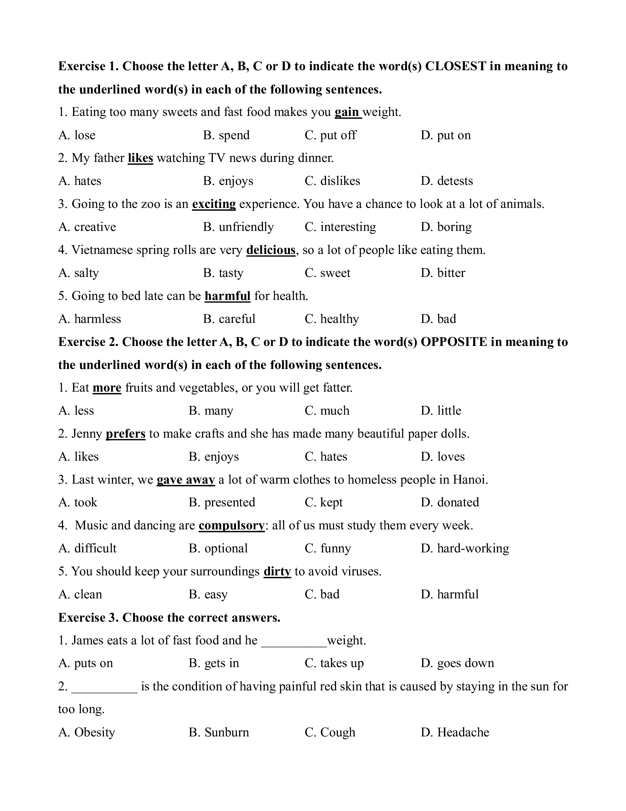 Exercise 1. Choose the letter A, B, C or D to indicate the word(s) CLOSEST in meaning to
