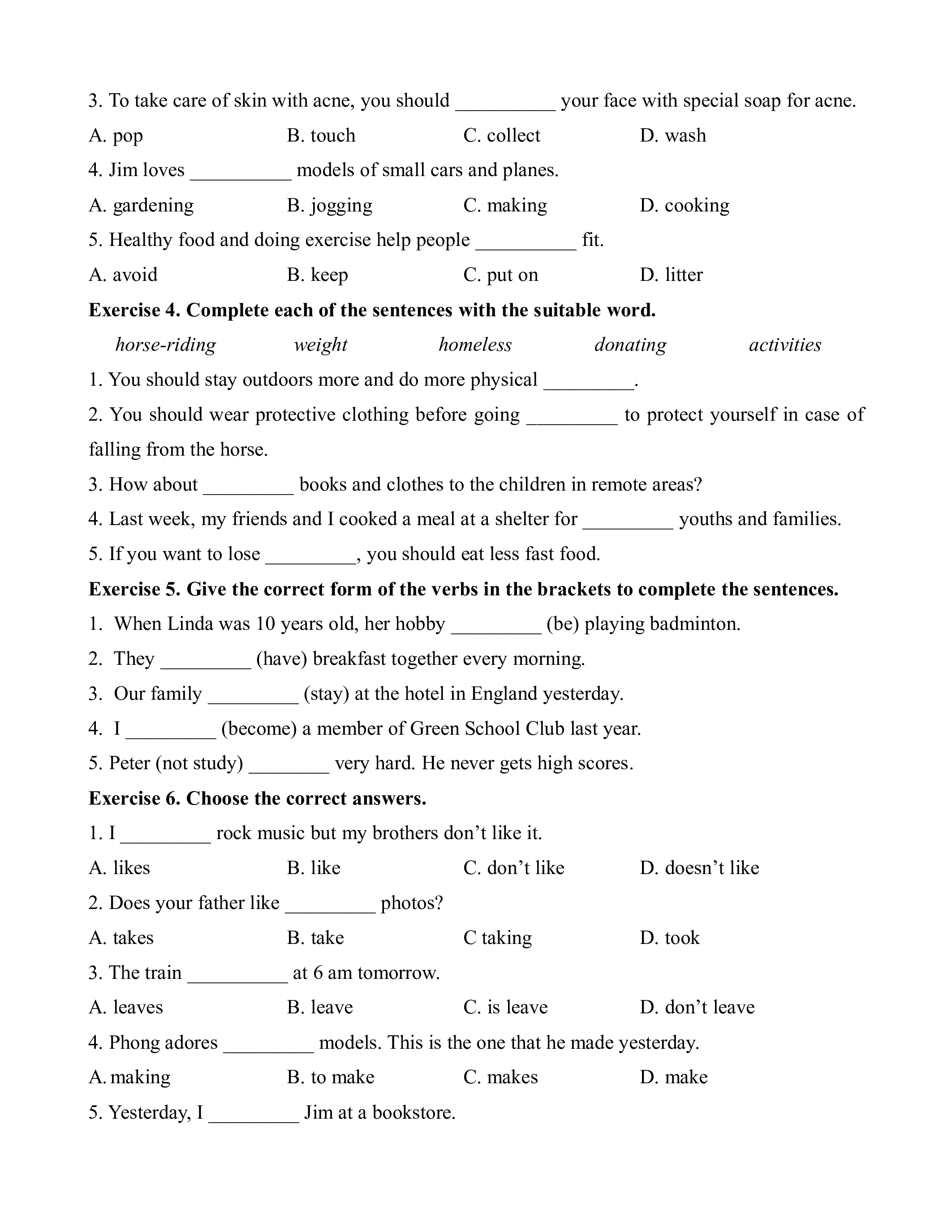 5. Healthy food and doing exercise help people __________ fit. A. avoid B. keep C. put on D. litter