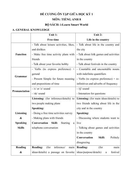 Đề cương ôn tập Giữa kì 1 Tiếng Anh 8 ilearn Smart world