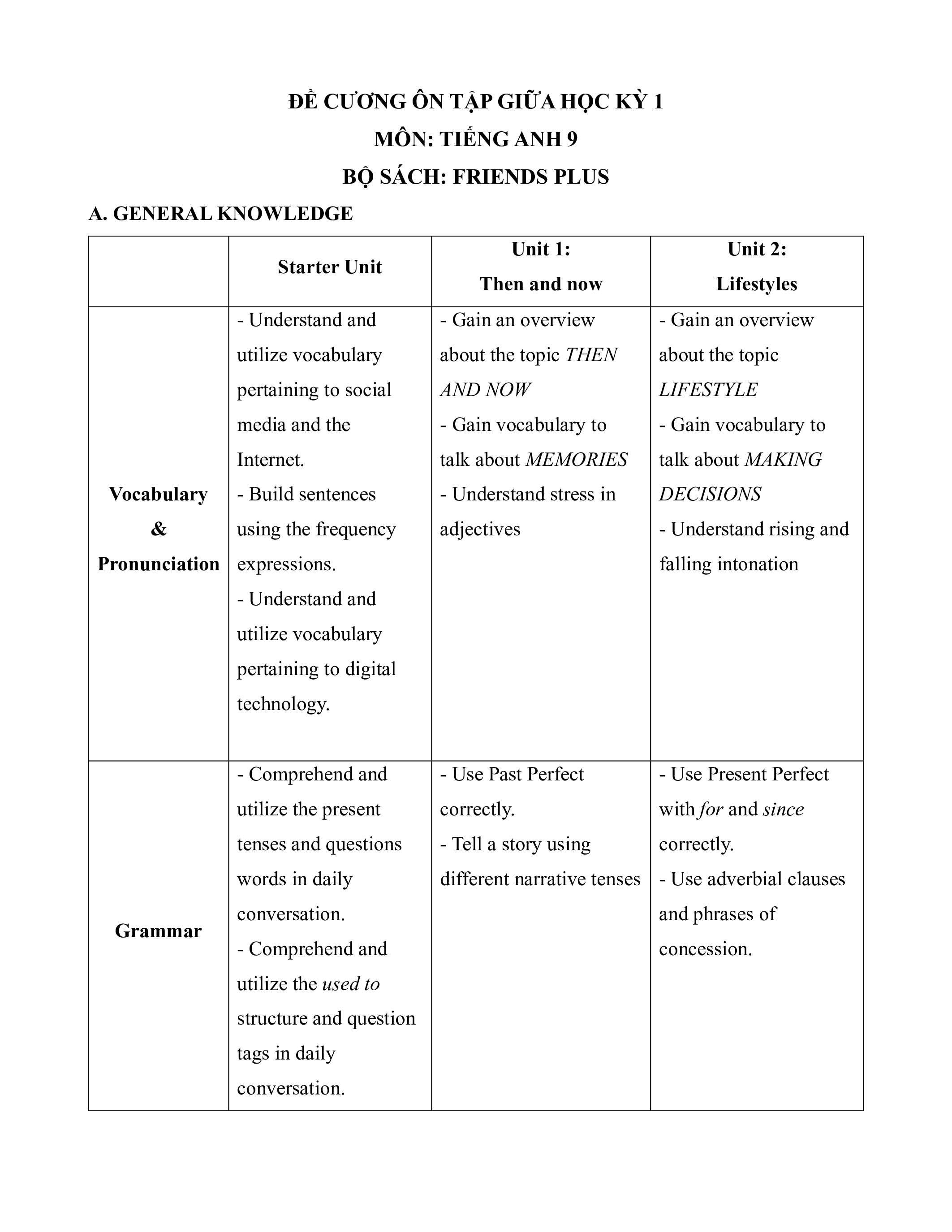 Đề cương ôn tập Giữa kì 1 Tiếng Anh 9 Friends Plus