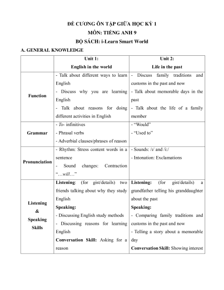 Đề cương ôn tập Giữa kì 1 Tiếng Anh 9 ilearn Smart world
