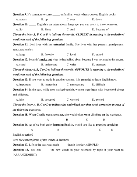 Question 9. It's common to come _____ unfamiliar words when you read English books. A. across B. up C. over D. down