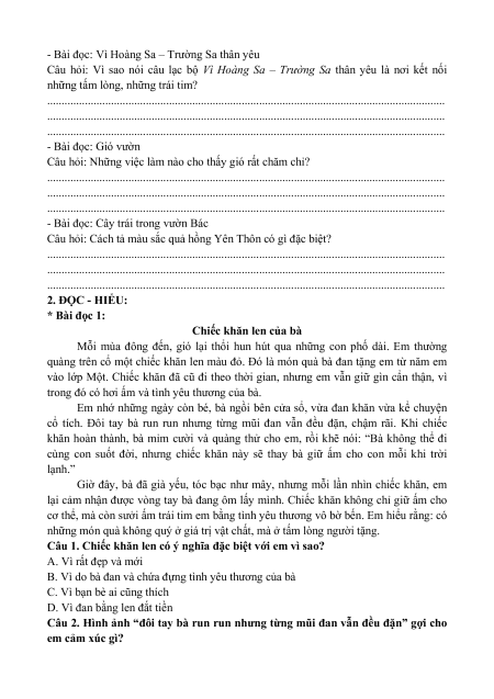 Câu 1. Chiếc khăn len có ý nghĩa đặc biệt với em vì sao? A. Vì rất đẹp và mới