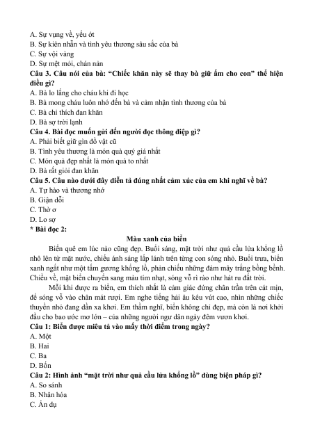A. Tự hào và thương nhớ B. Giận dỗi C. Thờ ơ D. Lo sợ * Bài đọc 2: Màu xanh của biển