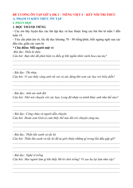 ĐỀ CƯƠNG ÔN TẬP GIỮA HK I – TIẾNG VIỆT 4 – KẾT NỐI TRI THỨC