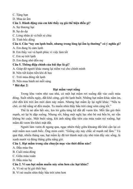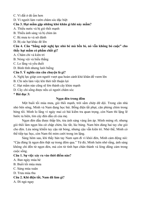 Câu 1. Hạt mầm trong câu chuyện mọc vào thời điểm nào? A. Đầu mùa thu B. Cuối mùa đông C. Giữa mùa xuân D. Đầu mùa hạ