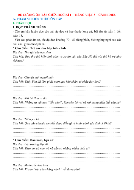 ĐỀ CƯƠNG ÔN TẬP GIỮA HỌC KÌ I – TIẾNG VIỆT 5 – CÁNH DIỀU