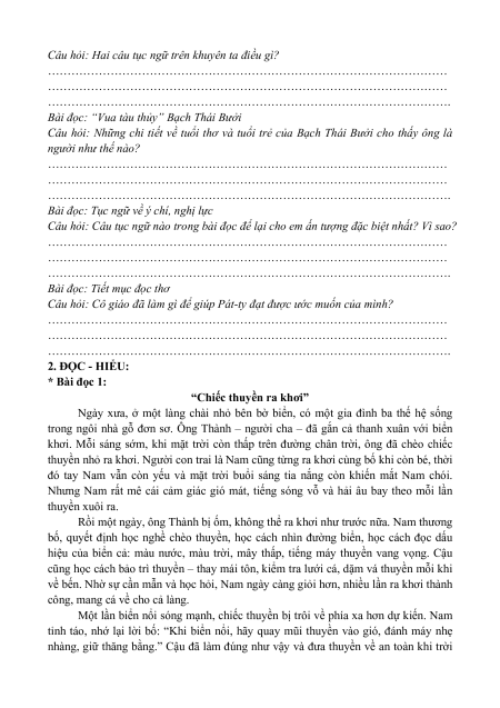 …………………………………………………………………………………………. 2. ĐỌC - HIỂU: * Bài đọc 1: