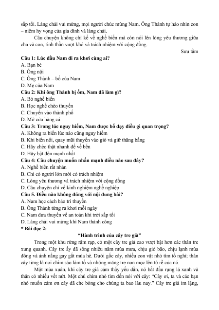 Câu 2: Khi ông Thành bị ốm, Nam đã làm gì? A. Bỏ nghề biển B. Học nghề chèo thuyền C. Chuyển vào thành phố D. Mở cửa hàng cá