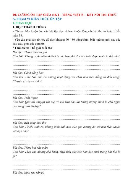 ĐỀ CƯƠNG ÔN TẬP GIỮA HK I – TIẾNG VIỆT 5 – KẾT NỐI TRI THỨC