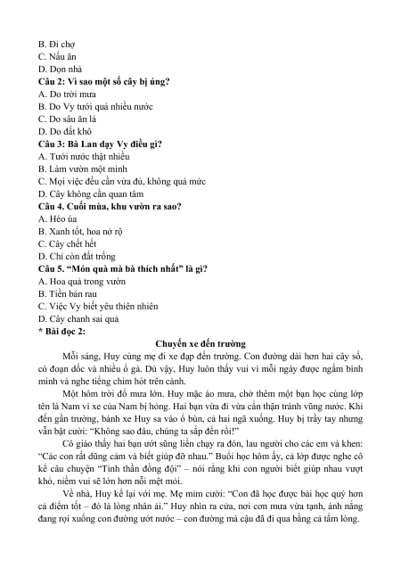 Câu 1: Bà Lan có thói quen gì mỗi buổi sáng? A. Ra vườn chăm cây B. Đi chợ C. Nấu ăn D. Dọn nhà