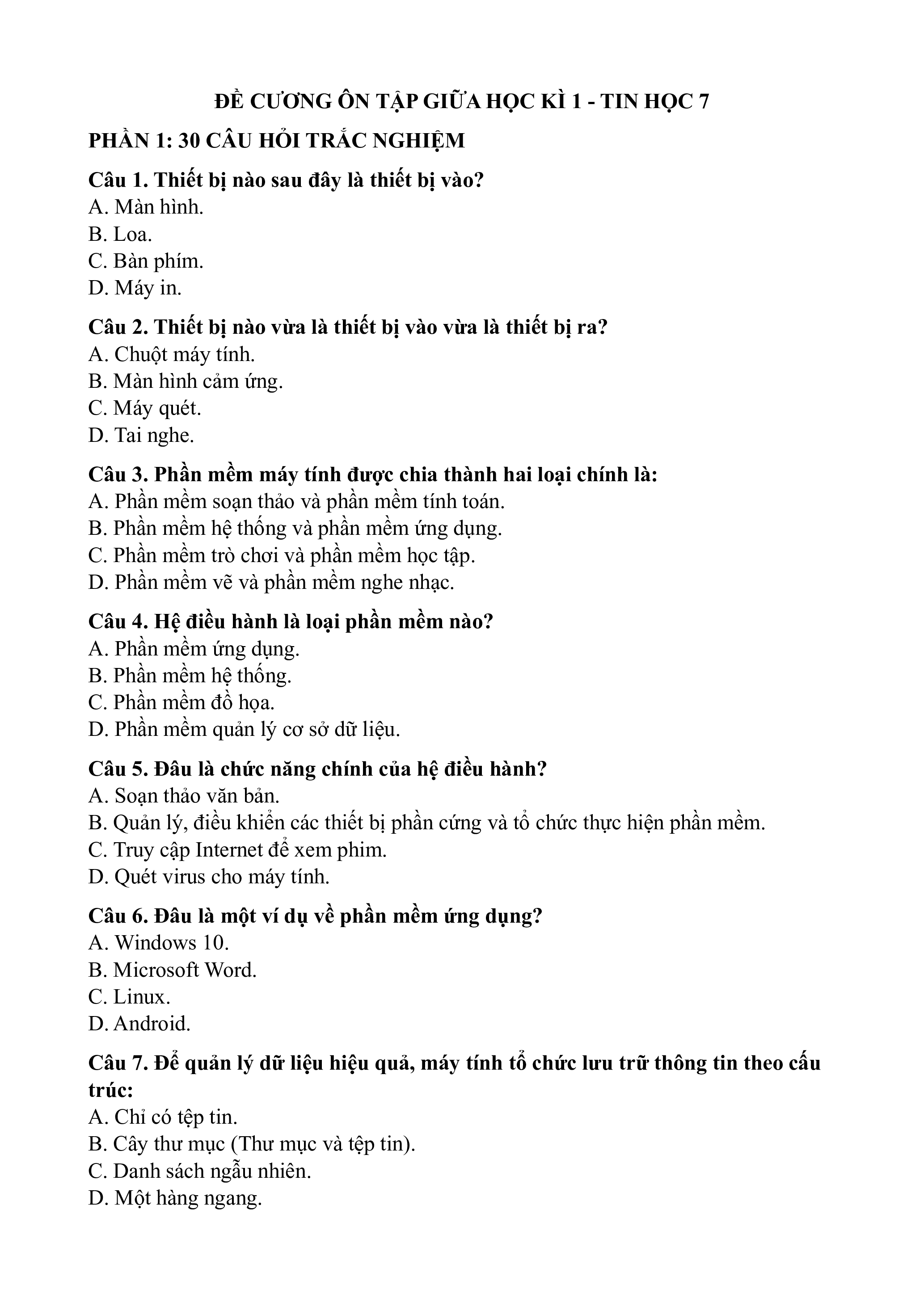 ĐỀ CƯƠNG ÔN TẬP GIỮA HỌC KÌ 1 - TIN HỌC 7