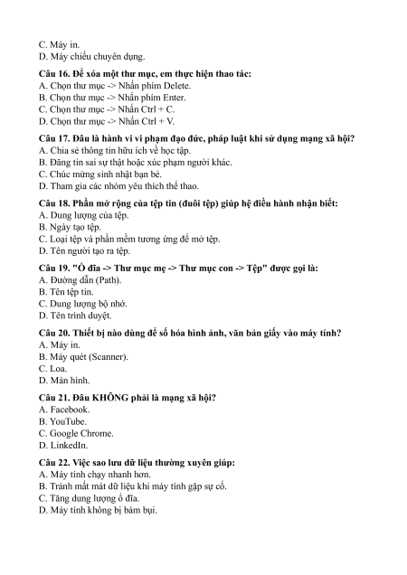 Câu 20. Thiết bị nào dùng để số hóa hình ảnh, văn bản giấy vào máy tính? A. Máy in. B. Máy quét (Scanner). C. Loa. D. Màn hình.