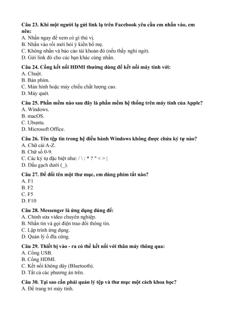 Câu 26. Tên tệp tin trong hệ điều hành Windows không được chứa ký tự nào? A. Chữ cái A-Z. B. Chữ số 0-9.