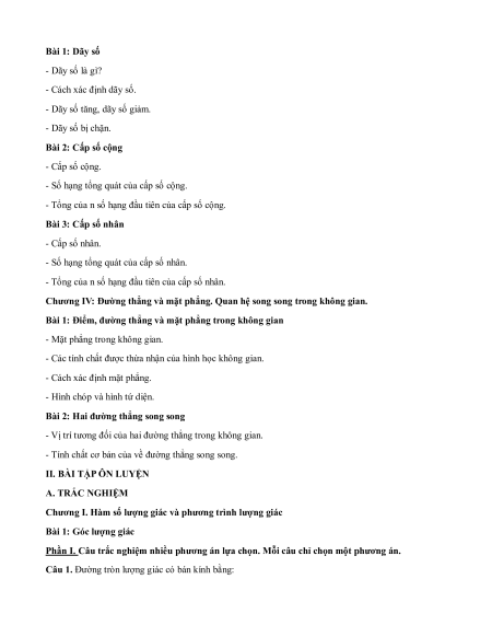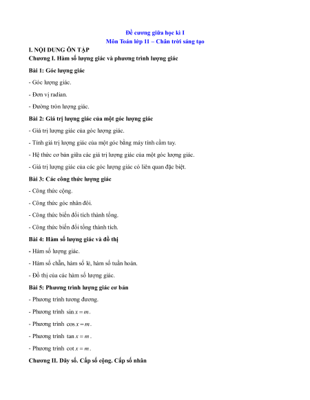 Môn Toán lớp 11 – Chân trời sáng tạo I. NỘI DUNG ÔN TẬP