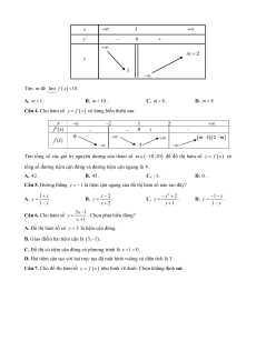 Câu 2. Tìm khoảng nghịch biến của hàm số: 3 2x y . x 7 A. ( ; 7) . B. ( ; ) . C. ( ; 7 ) và ( 7 ;) . D. ( 1 0;) . Câu 3. Hàm số 2