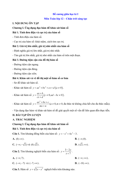 Đề cương ôn tập Giữa kì 1 Toán 12 Chân trời sáng tạo