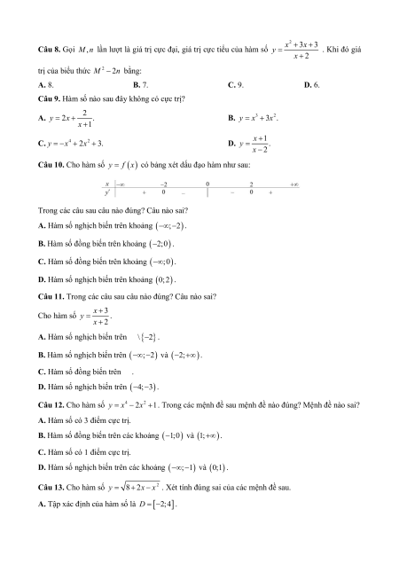 D. Hàm số nghịch biến trên các khoảng ; 1 và 0; 1 . Câu 13. Cho hàm số 2
