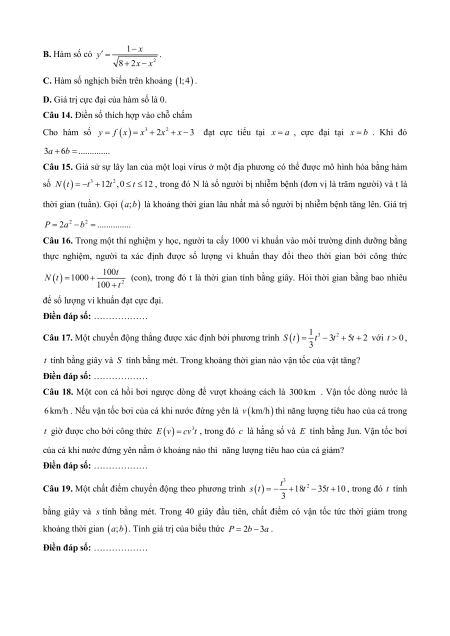 Câu 15. Giả sử sự lây lan của một loại virus ở một địa phương có thể được mô hình hóa bằng hàm số N t 3 2 t