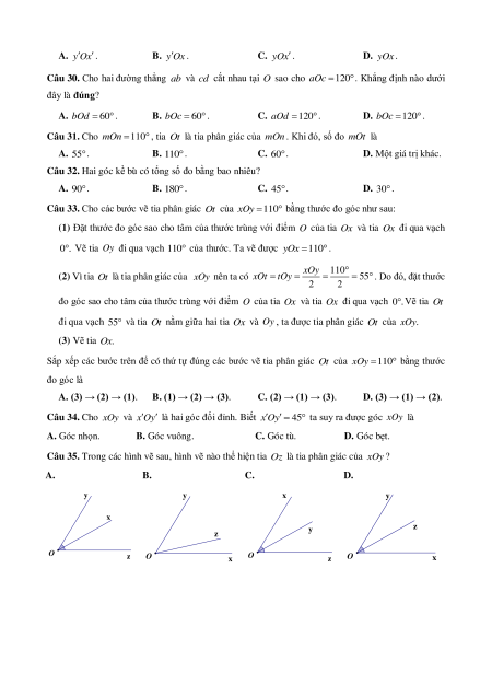 Câu 29. Hai đường thẳng xx và yy cắt nhau tại O . Góc đối đỉnh với yOx là