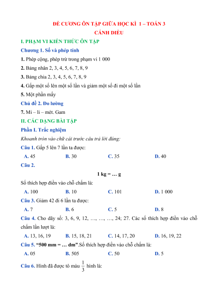 ĐỀ CƯƠNG ÔN TẬP GIỮA HỌC KÌ 1 – TOÁN 3 CÁNH DIỀU