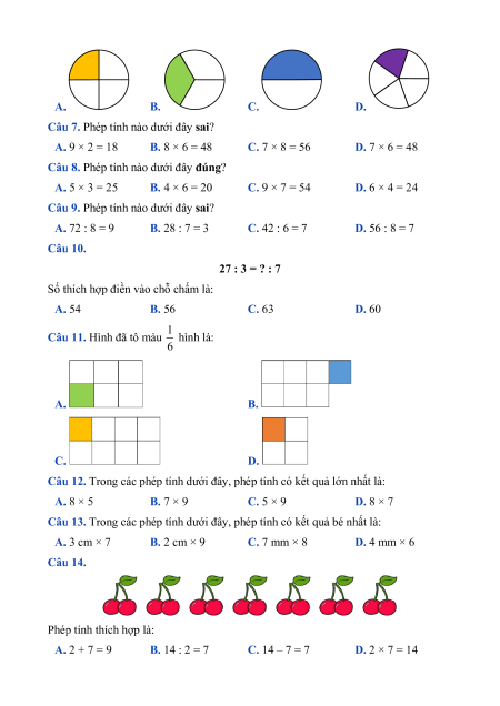 Câu 13. Trong các phép tính dưới đây, phép tính có kết quả bé nhất là: A. 3 cm × 7 B. 2 cm × 9 C. 7 mm × 8 D. 4 mm × 6 Câu 14. Phép tính thích hợp là: A. 2 + 7 = 9 B. 14 : 2 = 7 C. 14 – 7 = 7 D. 2 × 7 = 14