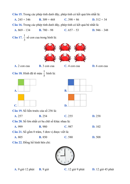 Câu 15. Trong các phép tính dưới đây, phép tính có kết quả lớn nhất là: A. 245 + 346 B. 309 + 468 C. 398 + 86 D. 512 + 34