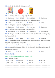 Câu 28. Hùng có 7 viên bi. Số viên bi Tuấn có nhiều gấp 3 lần số bi của Hùng. Vậy bạn Tuấn có số bi là: A. 24 viên bi B. 14 viên bi C. 21 viên bi D. 27 viên bi