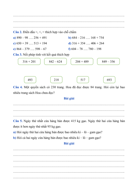 Câu 1. Đặt tính rồi tính a) 561 + 230 b) 405 + 359 c) 519 + 88 d) 436 + 46 e) 846 – 167 f) 463 – 112 g) 708 – 75 h) 694 – 53