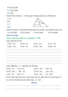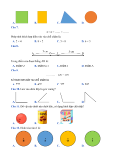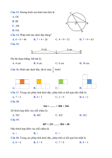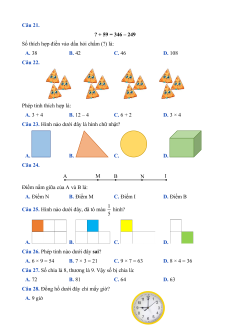 Số thích hợp điền vào dấu hỏi chấm (?) là: A. 38 B. 42 C. 46 D. 108 Câu 22. Phép tính thích hợp là: A. 3 + 4 B. 12 – 4 C. 6 + 2 D. 3 × 4