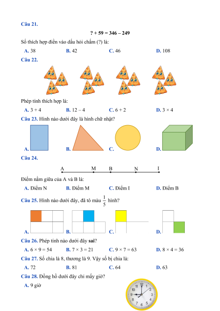Câu 20. Trong các phép tính dưới đây, phép tính có kết quả lớn nhất là: A. 8 × 4 B. 5 × 9 C. 7 × 8 D. 9 × 3 Câu 21. ? + 59 = 346 – 249