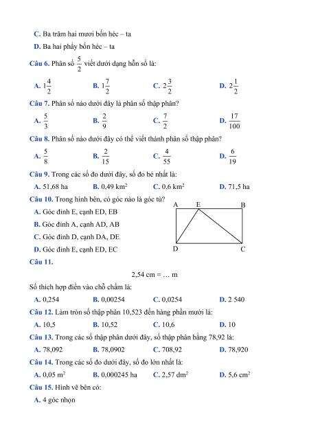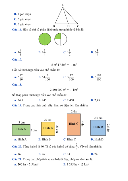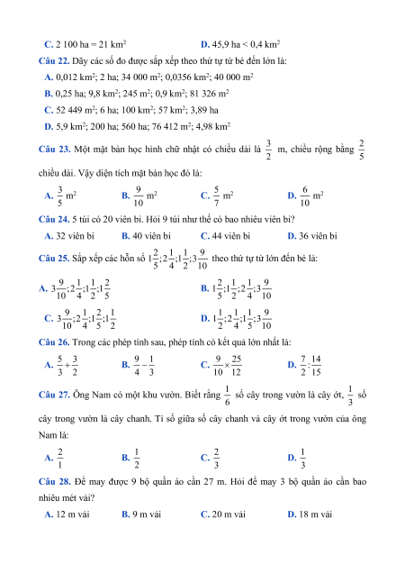 Hỗn số thích hợp điền vào chỗ chấm là: A. 17 5 B. 7 51 C. 17 5 D. 107 5 10 100 100 100 Câu 18. 2 450 000 m2 = … km2