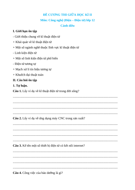 - Tailieugiaovien.com.vn giới thiệu bộ Đề cương ôn tập Giữa kì 2 Công nghệ 12 Điện, Điện tử Cánh diều theo cấu trúc mới nhất nhằm giúp Giáo viên có thêm tài liệu tham khảo ra đề thi Công nghệ 12.