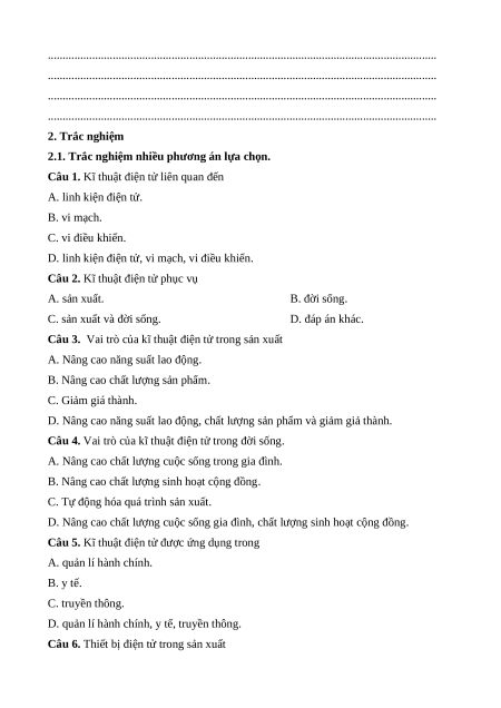 Câu 2. Kĩ thuật điện tử phục vụ A. sản xuất. B. đời sống.