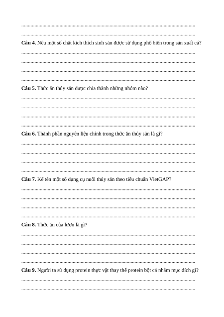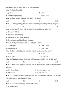 Câu 13. Thức ăn thủy sản gồm mấy thành phần dinh dưỡng? A. 1 B. 2 C. 3 D. 4