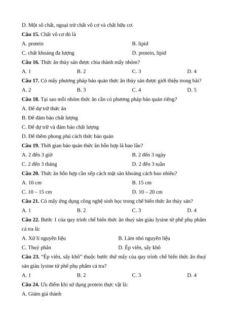Câu 14. Chất khô trong thức ăn của thủy sản có: A. Chất vô cơ B. Chất hữu cơ