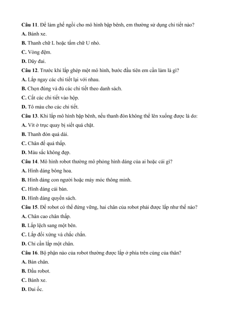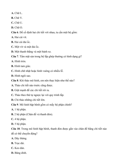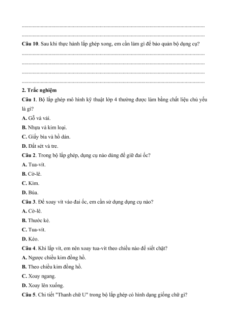 Câu 1. Bộ lắp ghép mô hình kỹ thuật lớp 4 thường được làm bằng chất liệu chủ yếu là gì? A. Gỗ và vải.