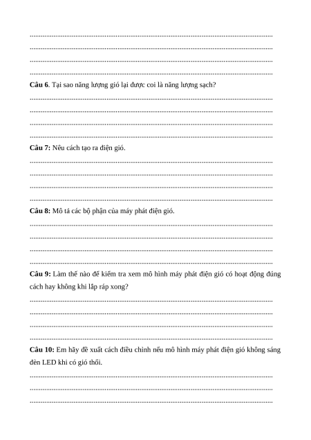 Câu 10: Em hãy đề xuất cách điều chỉnh nếu mô hình máy phát điện gió không sáng đèn LED khi có gió thổi.
