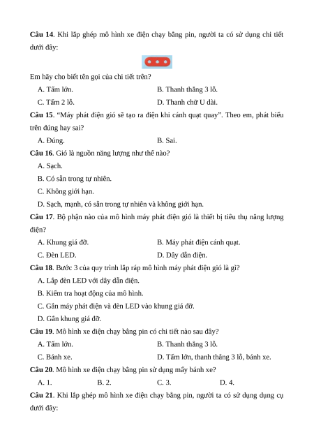 Câu 12. Mô hình xe điện chạy bằng pin được chia thành mấy phần? A. 1. B. 2. C. 3. D. 4.